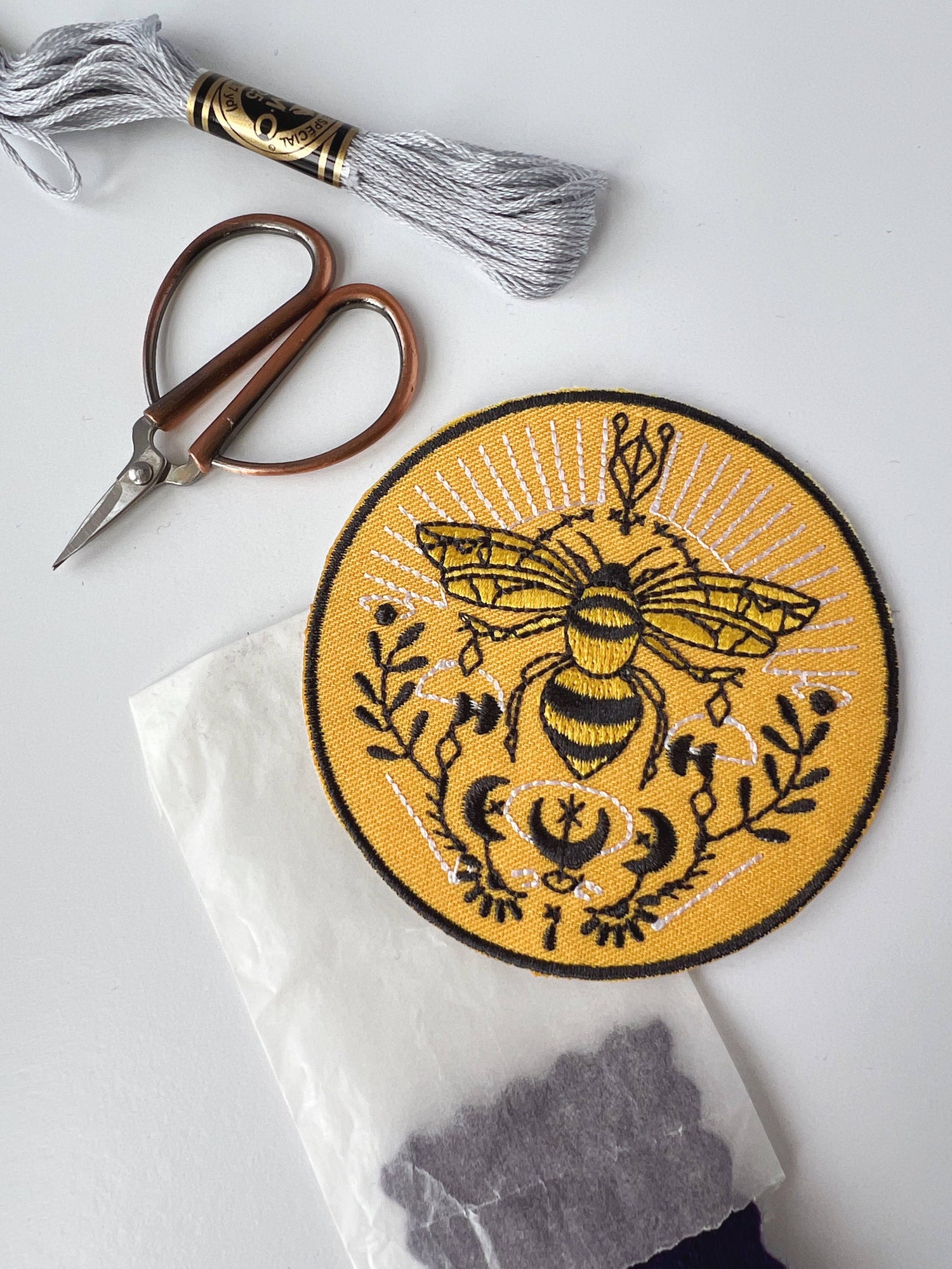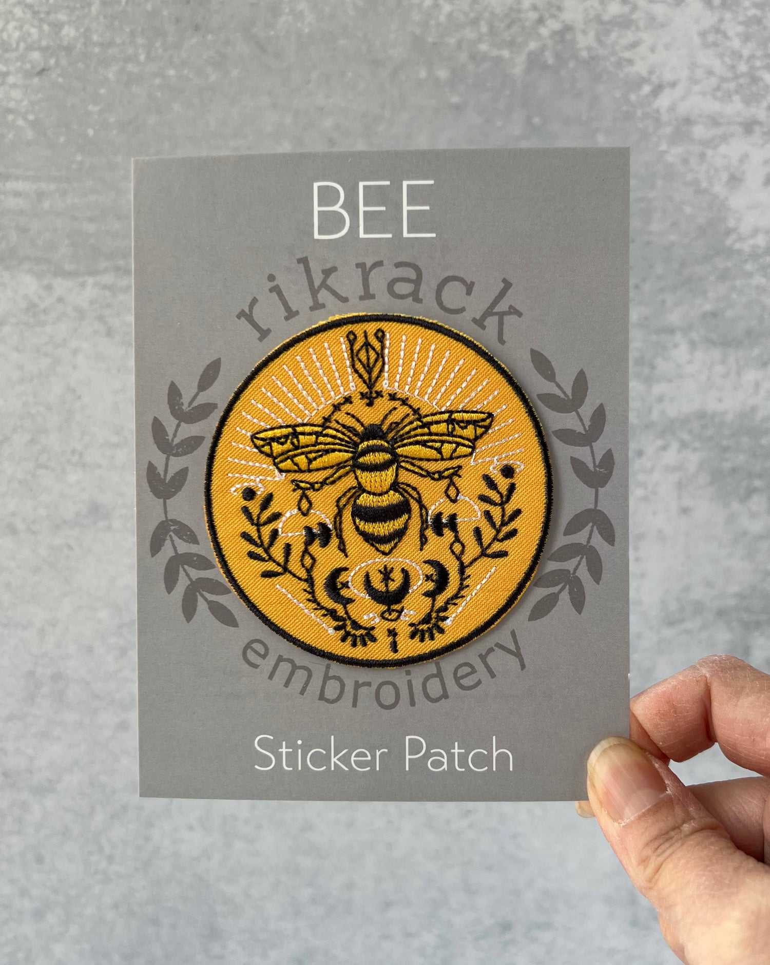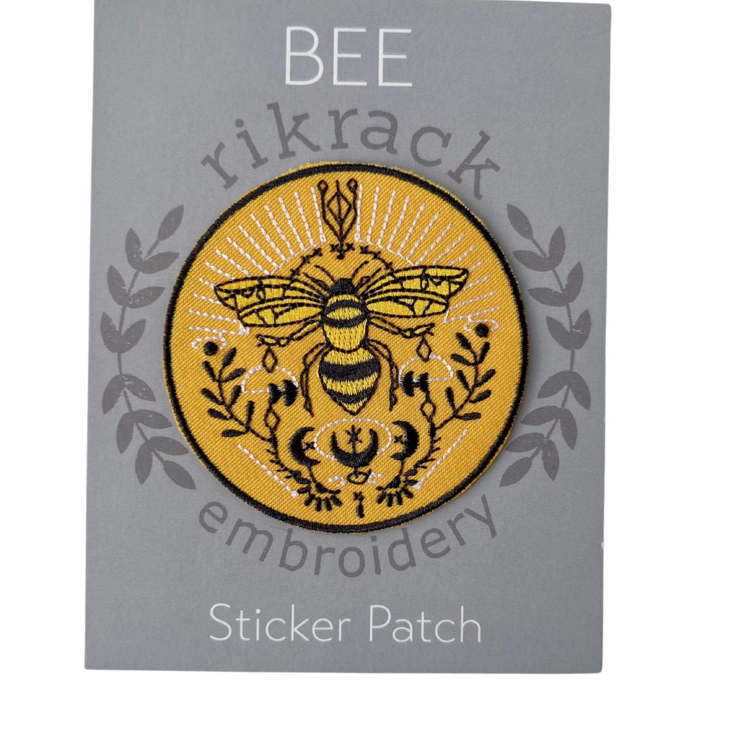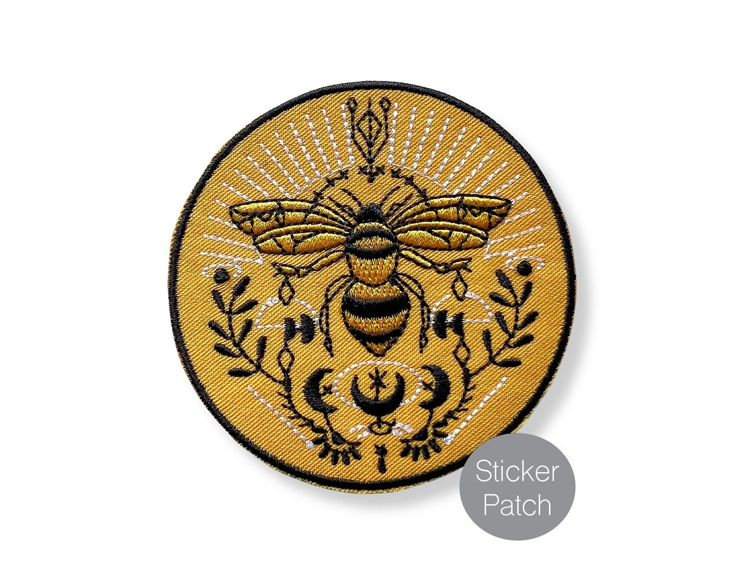 Bee lover Sticker Patch. Super detailed embroidered bee with decorative nature elements. Embroidered sticker patch is 3 inches with finished stitch edge. Packaged on paper backer in a poly sleeve. You can easily peal off the back and stick your patch anywhere. No need to sew!