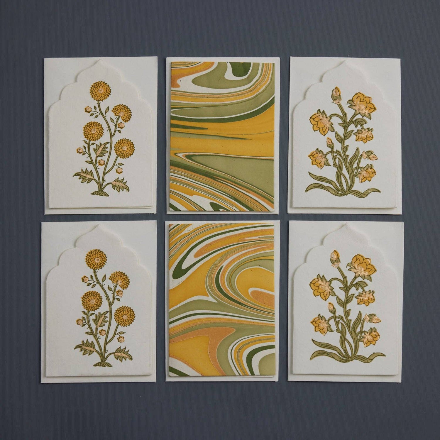 Each set features 6 beautiful, die-cut notecards and envelopes, handcrafted by artisans in India, using traditional techniques of wood block printing and hand marbling.