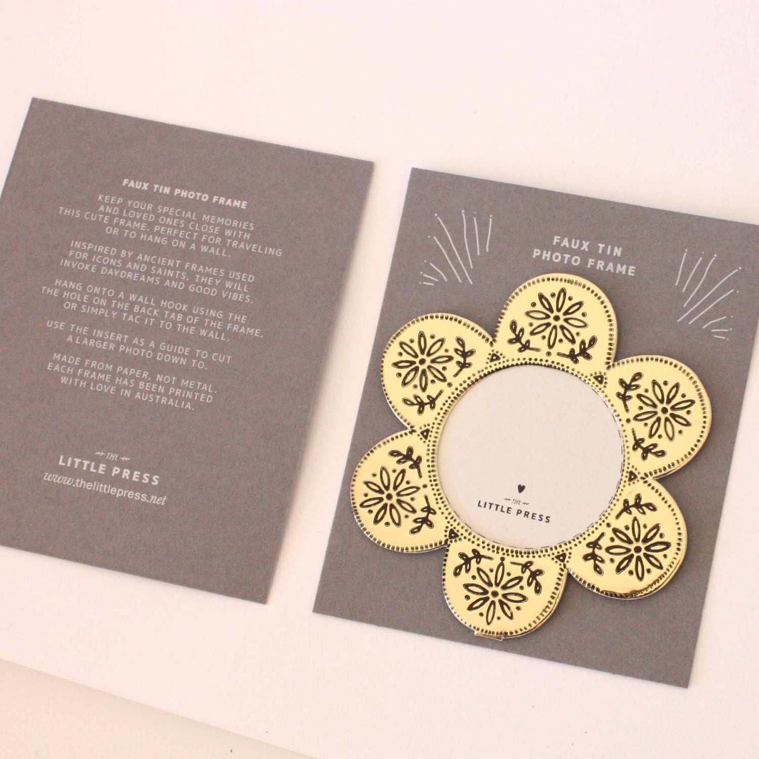 Letterpress printed with shiny foil paper, they look so much like pressed tin, but are lighter and without heavy metals used in tin. * photo window size 45mm diameter * size of flower frame 90 x 85mm edge to edge * cut your photo to a square to sit inside the circle * has a little tab with hole cut out to hook onto a wall nail or simply tac to the wall * blank inside for you to add your own photo, art or message on some paper * Each frame has been letterpress printed with love