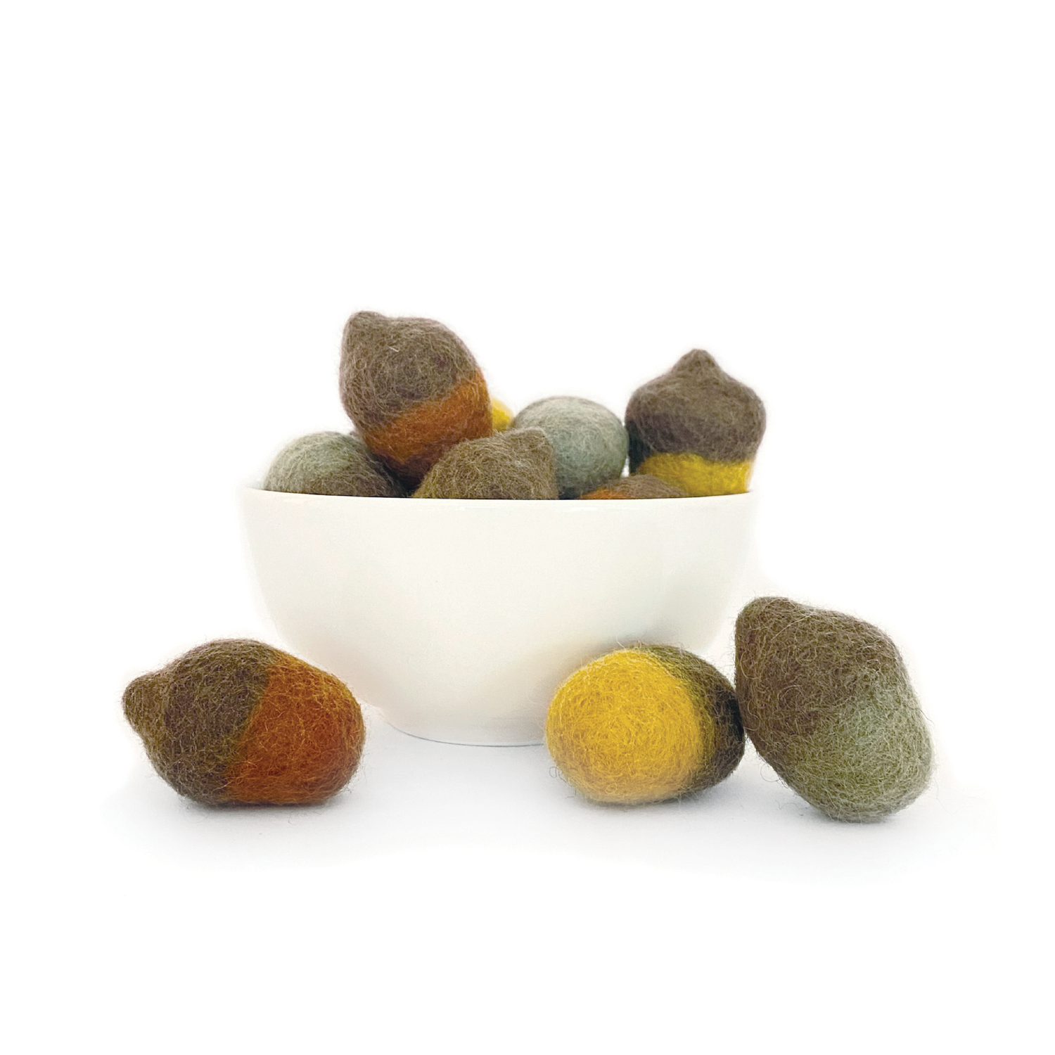 These woodland, felt acorns are made from 100% New Zealand wool and come in three cozy colors (noted below) to complement your autumn, Thanksgiving, woodland nursery or everyday decor. * Acorns are approximately 2 in. tall x 1.5 in. wide * Due to their handmade nature, the size of felt pieces may vary slightly