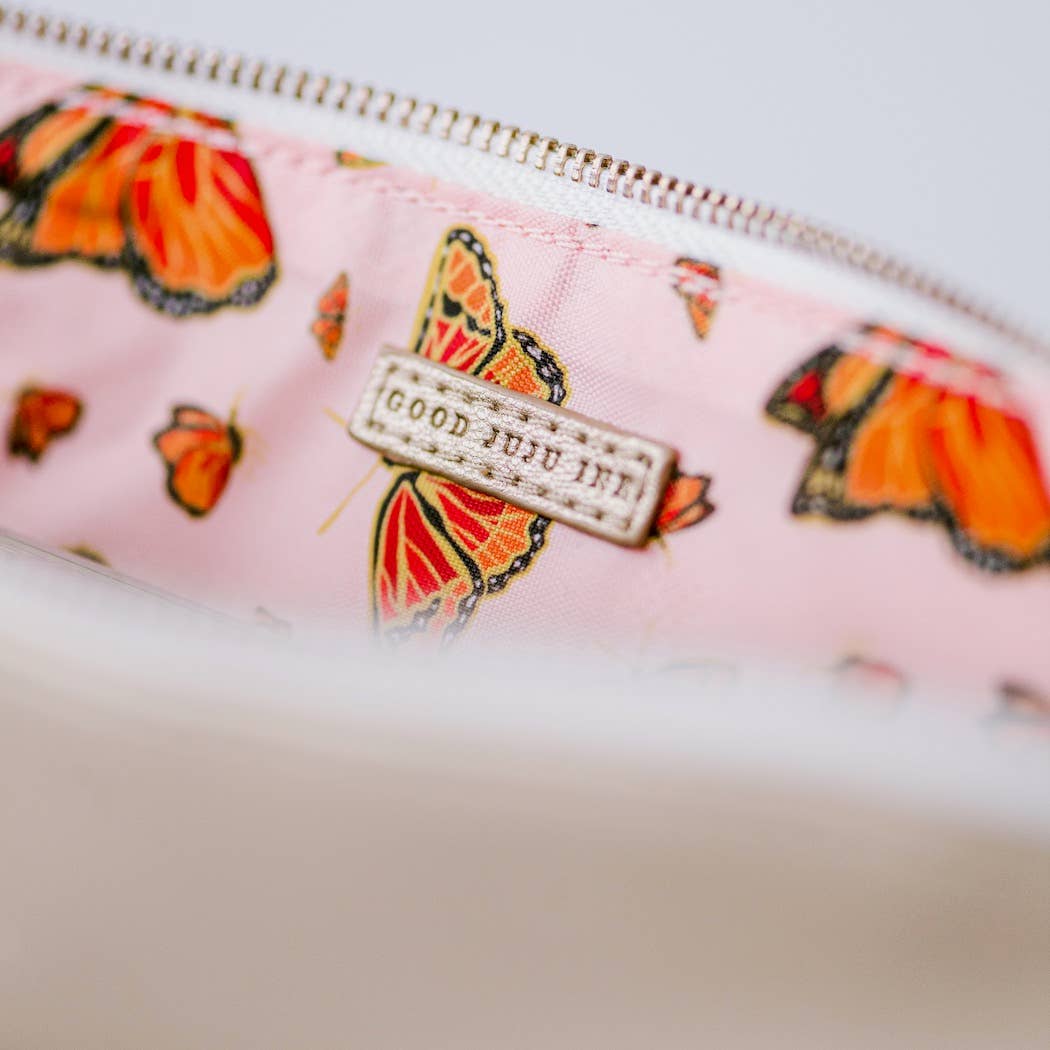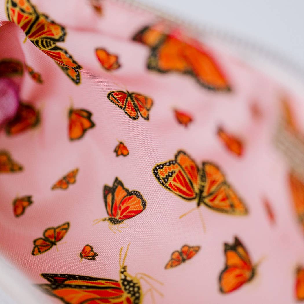 Pencil pouch features a butterfly pattern interior and is made of vegan leather with a luxurious velvet zipper pull. This beauty should fit most pens, pencils, and bits of bobbins we like to tuck away.