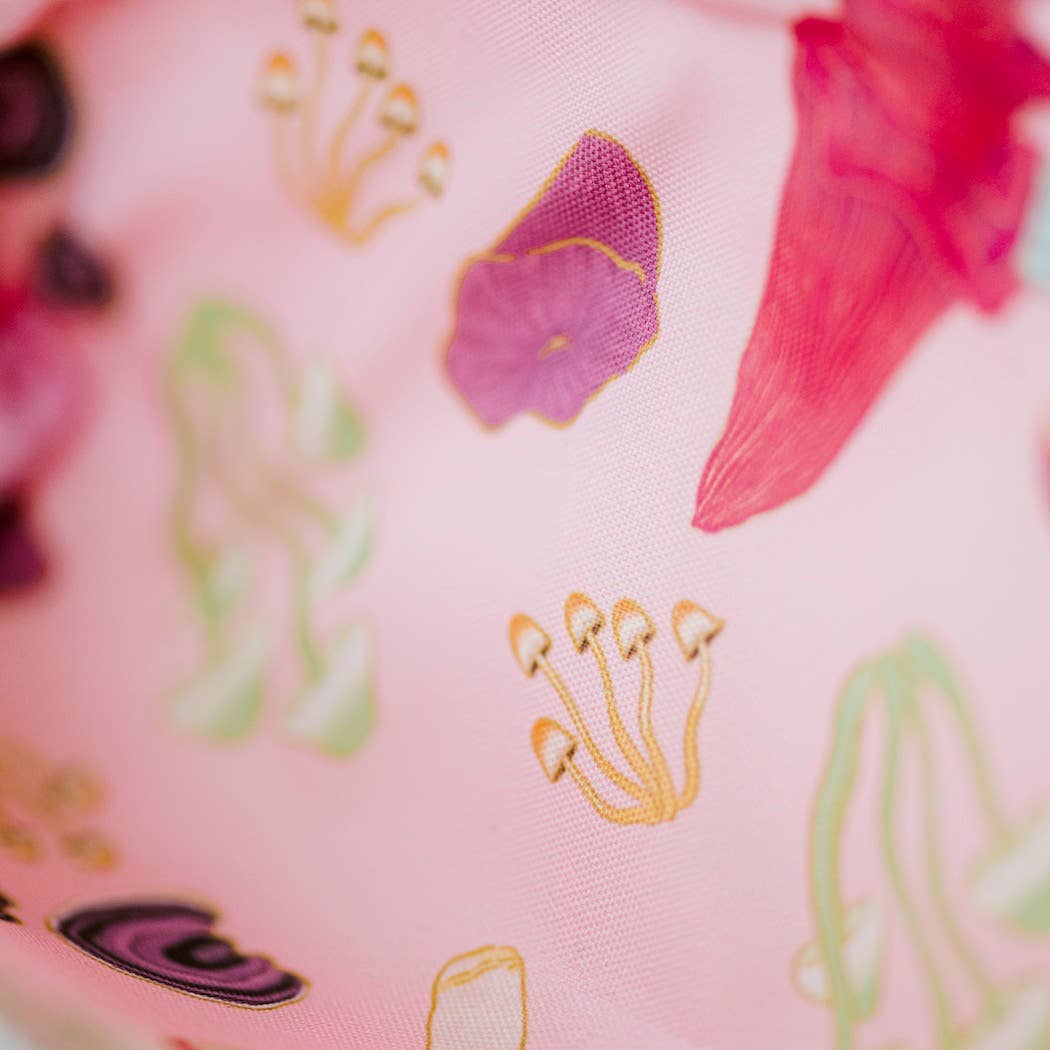 Pencil pouch features a mushroom pattern interior and is made of vegan leather with a luxurious velvet zipper pull. This beauty should fit most pens, pencils, and bits of bobbins we like to tuck away.
