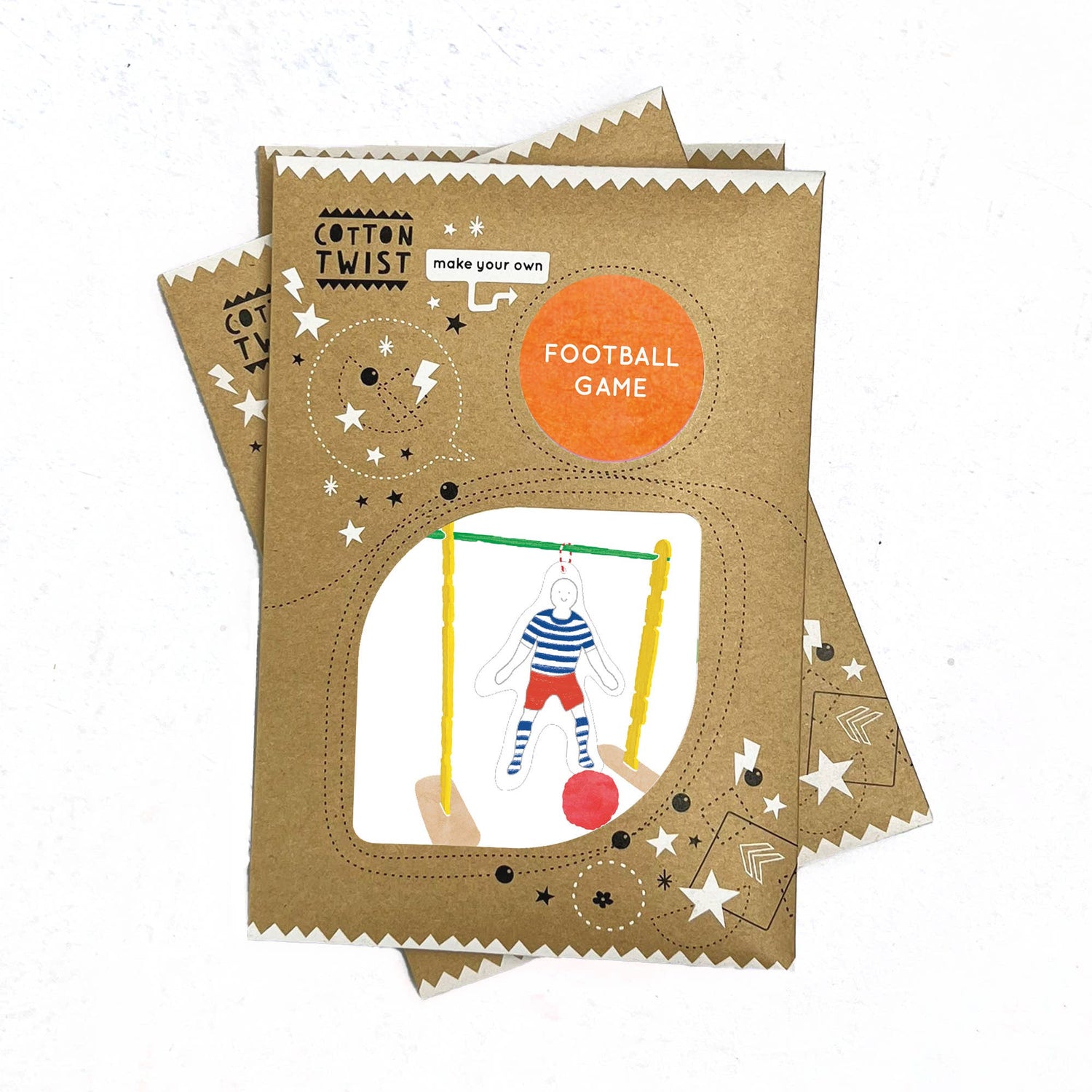MATERIAL - cardboard footballer cut out, goal cut outs, lollipop sticks, twine, pom pom DIMENSIONS - each pack comes with a recyclable kraft envelope measuring 16.5cm by 11.5cm together with an A6 printed instruction card