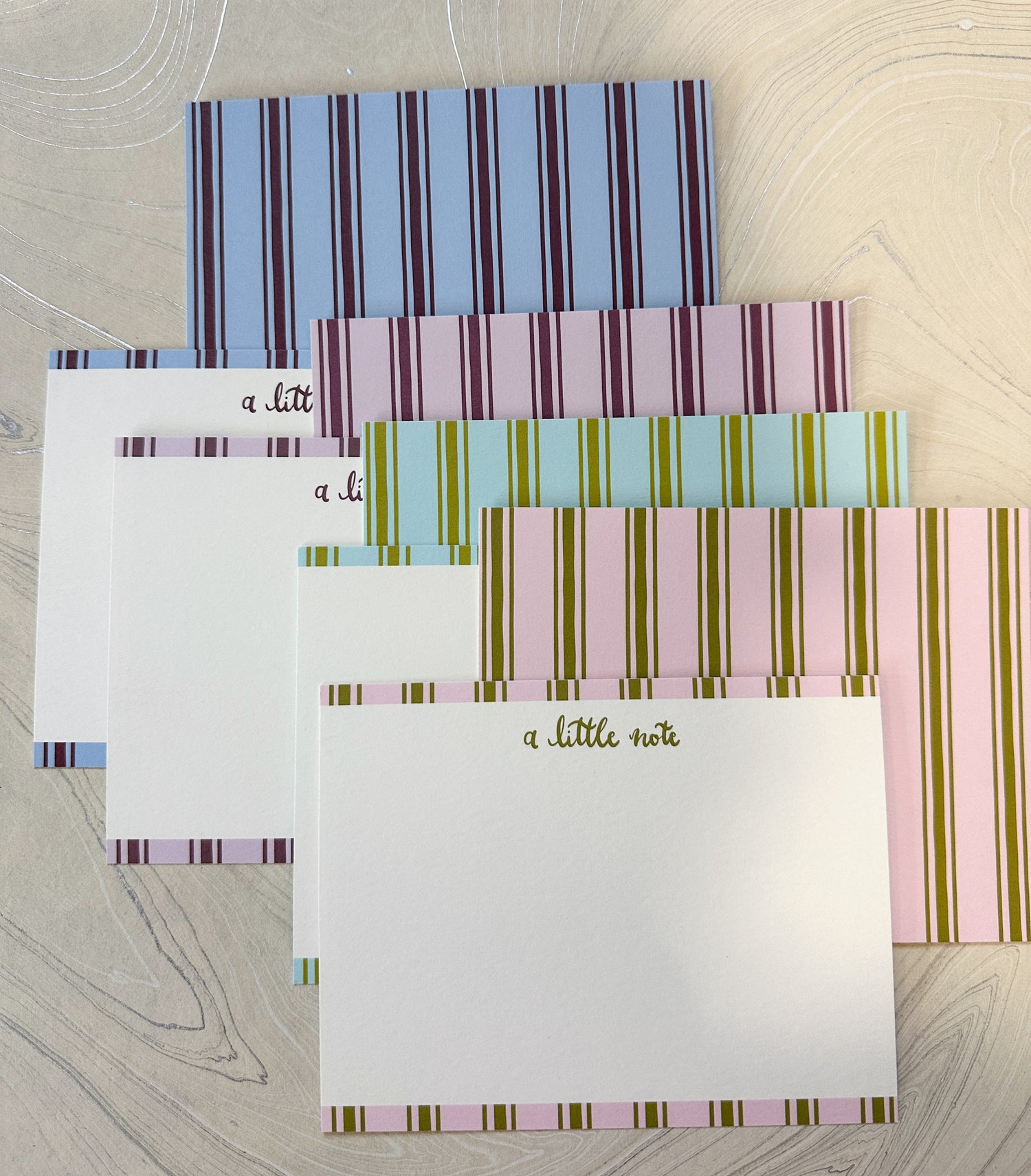We’re seeing stripes with this bold and playful stationery set! Perfect for “a little note” to friends and family. Set of 8 A2 (4.25x5.5) cards with white unlined envelope. 4 whimsical colors combos (2 of each) in a set.