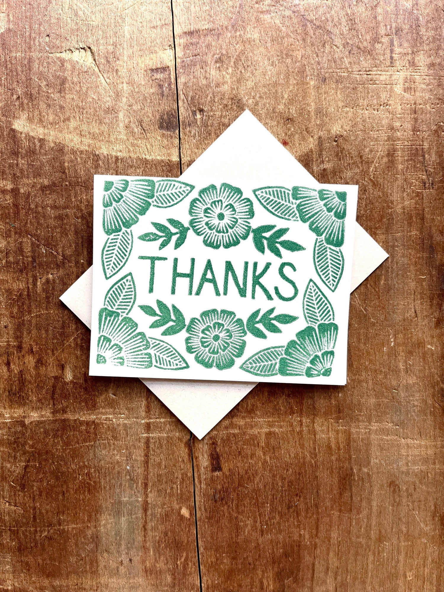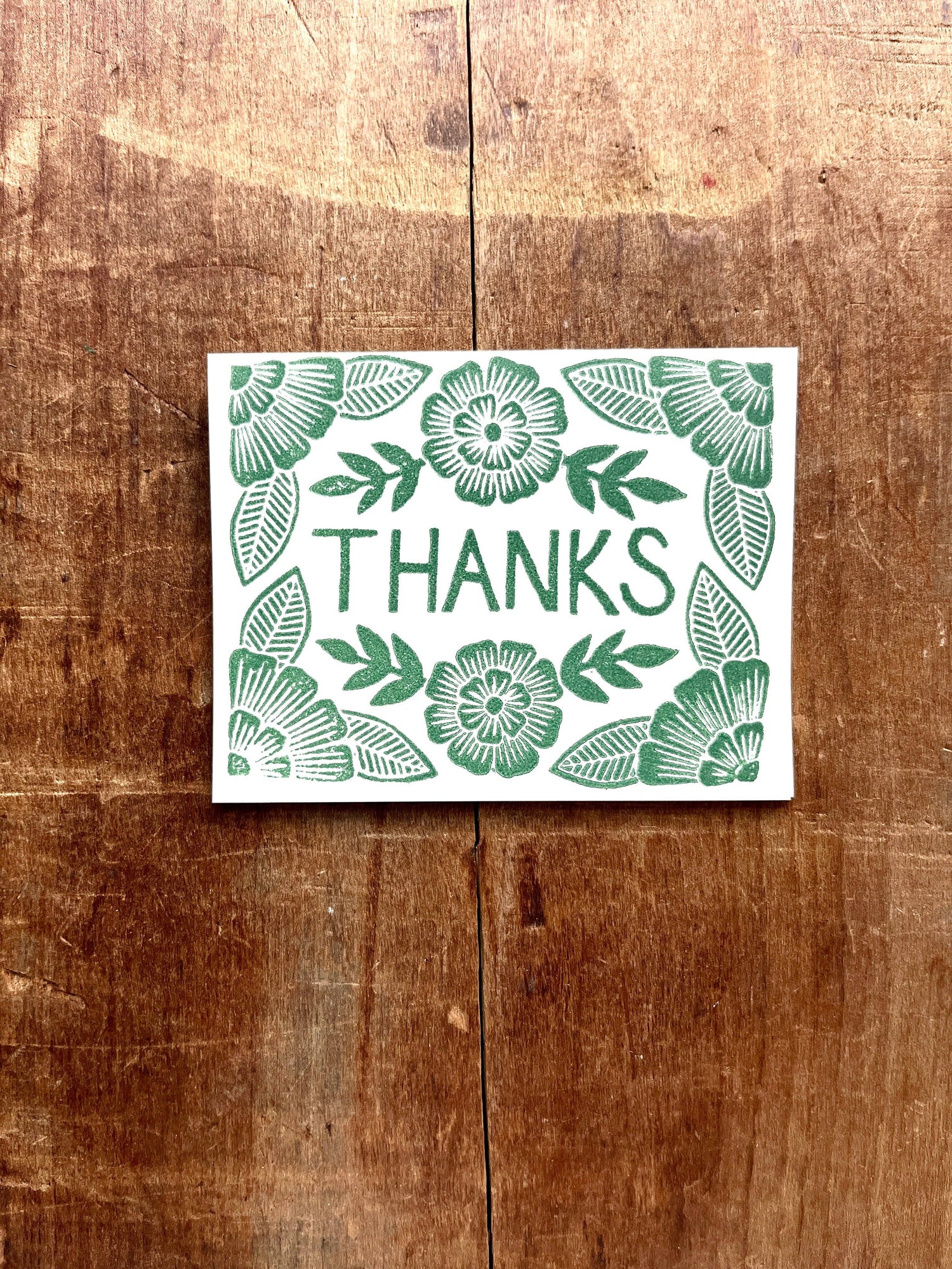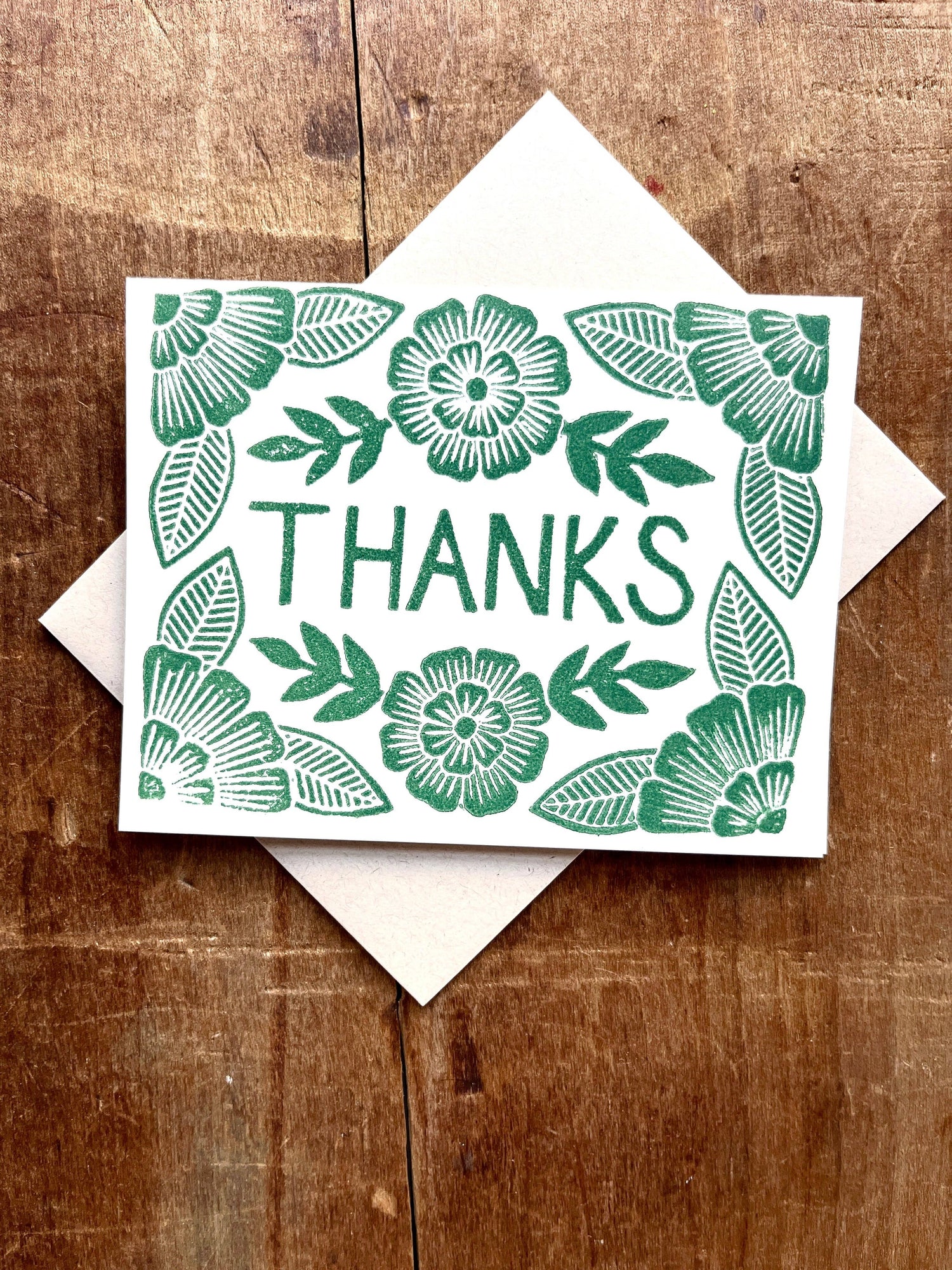 Each card is individually printed with oil-based ink, using our hand-carved linoleum blocks and our antique Chandler & Price printing press. Because these cards are handmade, small differences in color or printing texture are part of the product. All cards are made with oil-based ink and 100lb cardstock.