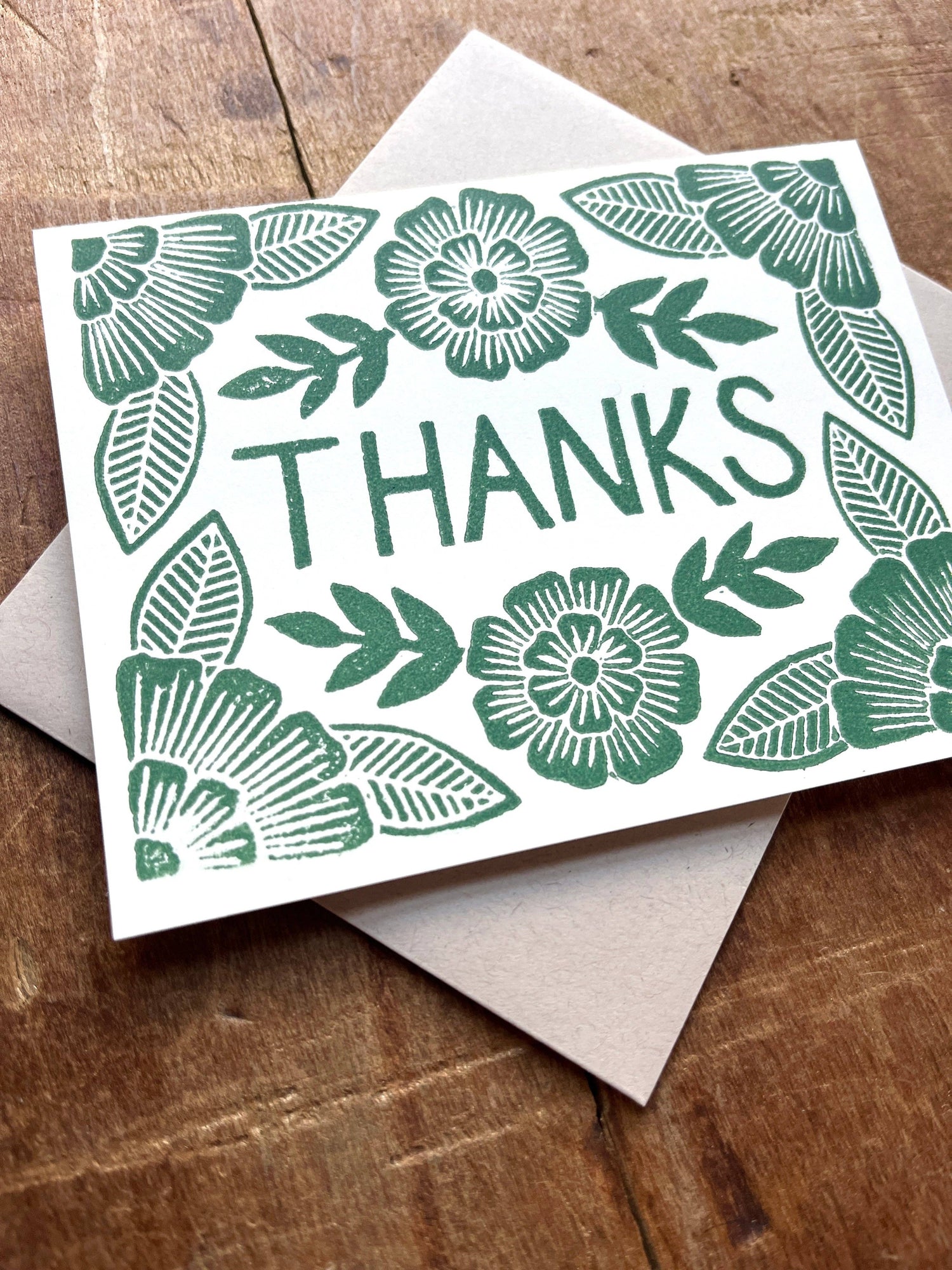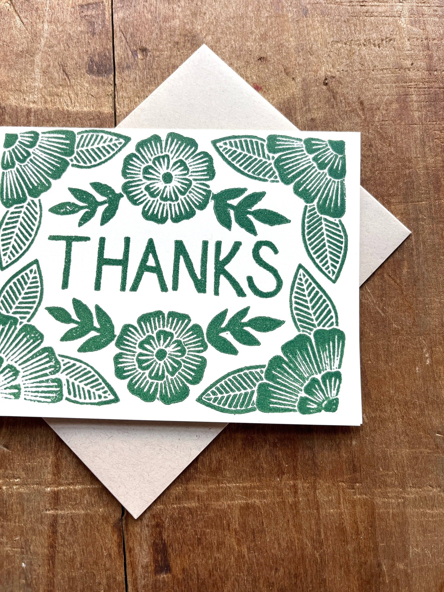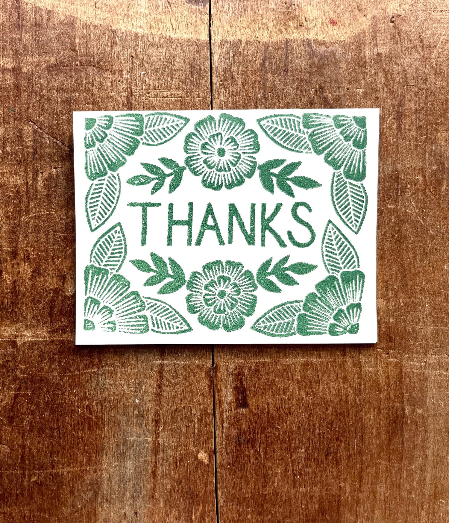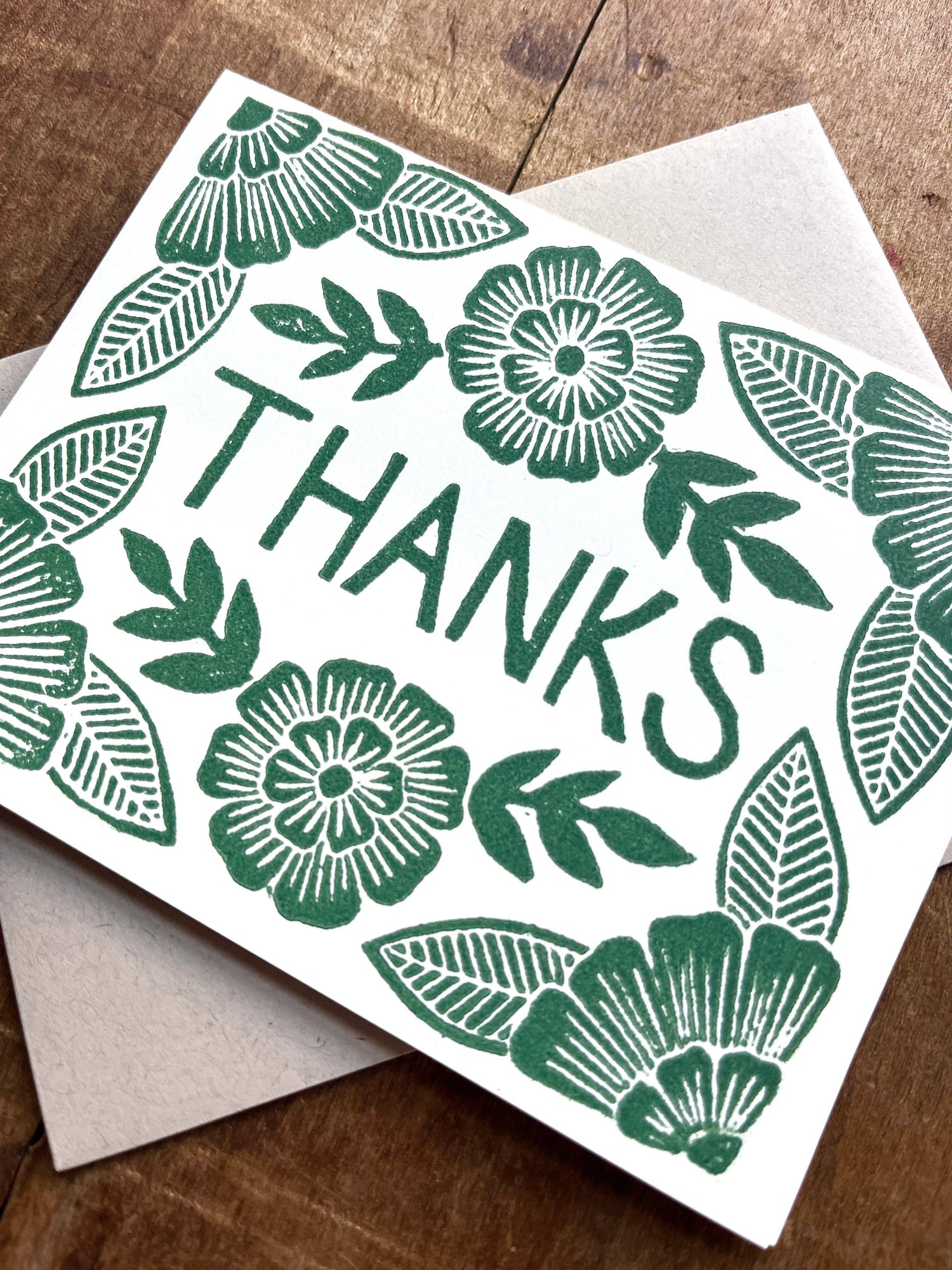 Each card is individually printed with oil-based ink, using our hand-carved linoleum blocks and our antique Chandler & Price printing press. Because these cards are handmade, small differences in color or printing texture are part of the product. All cards are made with oil-based ink and 100lb cardstock.