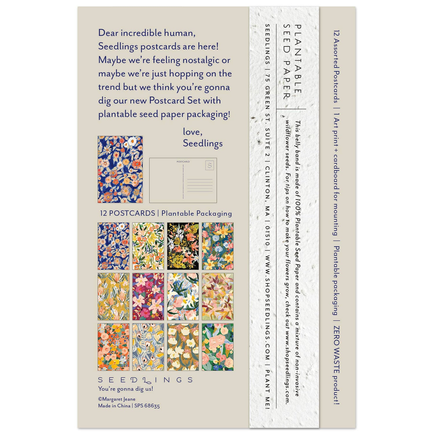 Assorted Postcard Sets have got it all growing on! Maybe we're feeling nostalgic or maybe we're just hopping on the trend but we think you're gonna dig our new assorted Postcard Set with PLANTABLE seed paper packaging. Set includes 12 assorted postcards each with unique foil details + a sweet spot on the back to write your bff's a message + address. Printed on premium tree-free textured paper this is a ZERO WASTE PRODUCT! Mail your postcards - cause snail mail really is the best mail... plant the packaging and flip over the info sheet for a BONUS foiled 4" x 6" art print that can be mounted to the cardboard packaging! Truly ZERO WASTE! size: 4" x 6"
